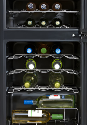 Uno de sus mayores atractivos es su sistema de doble zona de temperatura: Escoge una temperatura desde 5 °C hasta 17 °C. Esto permite conservar vinos blancos, rosados, y tintos en su punto óptimo simultáneamente. Así, cada vino se conserva exactamente como lo requiere, preservando su sabor, aroma y cuerpo hasta el momento de servir.